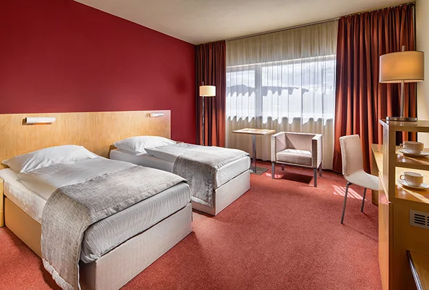 Double room with twin beds (20 m²). The room is equipped with satellite TV, coffee and tea making facilities, bathroom with bathtub and hairdryer, ironing set.