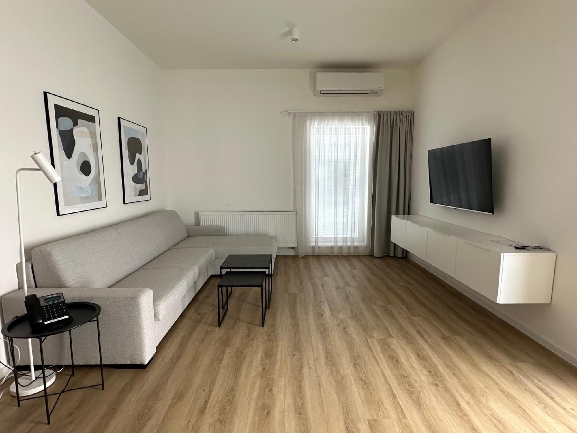 Modern apartment for up to 6 people (84 m²) with a living room, fully equipped kitchen, and two bedrooms. The apartment is furnished with tasteful designer furniture and three satellite TVs. Each bedroom has a double bed or two single beds, and the living room has a sofa bed for two people.