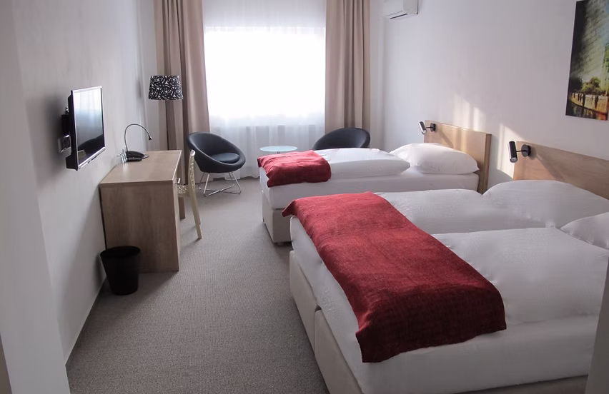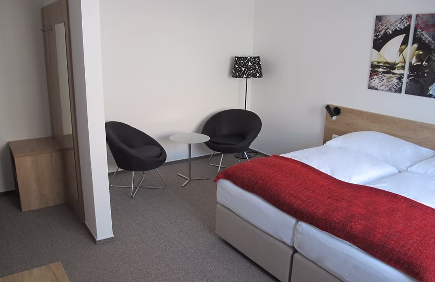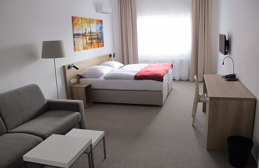 A modern 30 m² double room with a double bed or two separate beds and a sofa bed for two people, furnished with tasteful designer furniture and equipped with satellite TV.